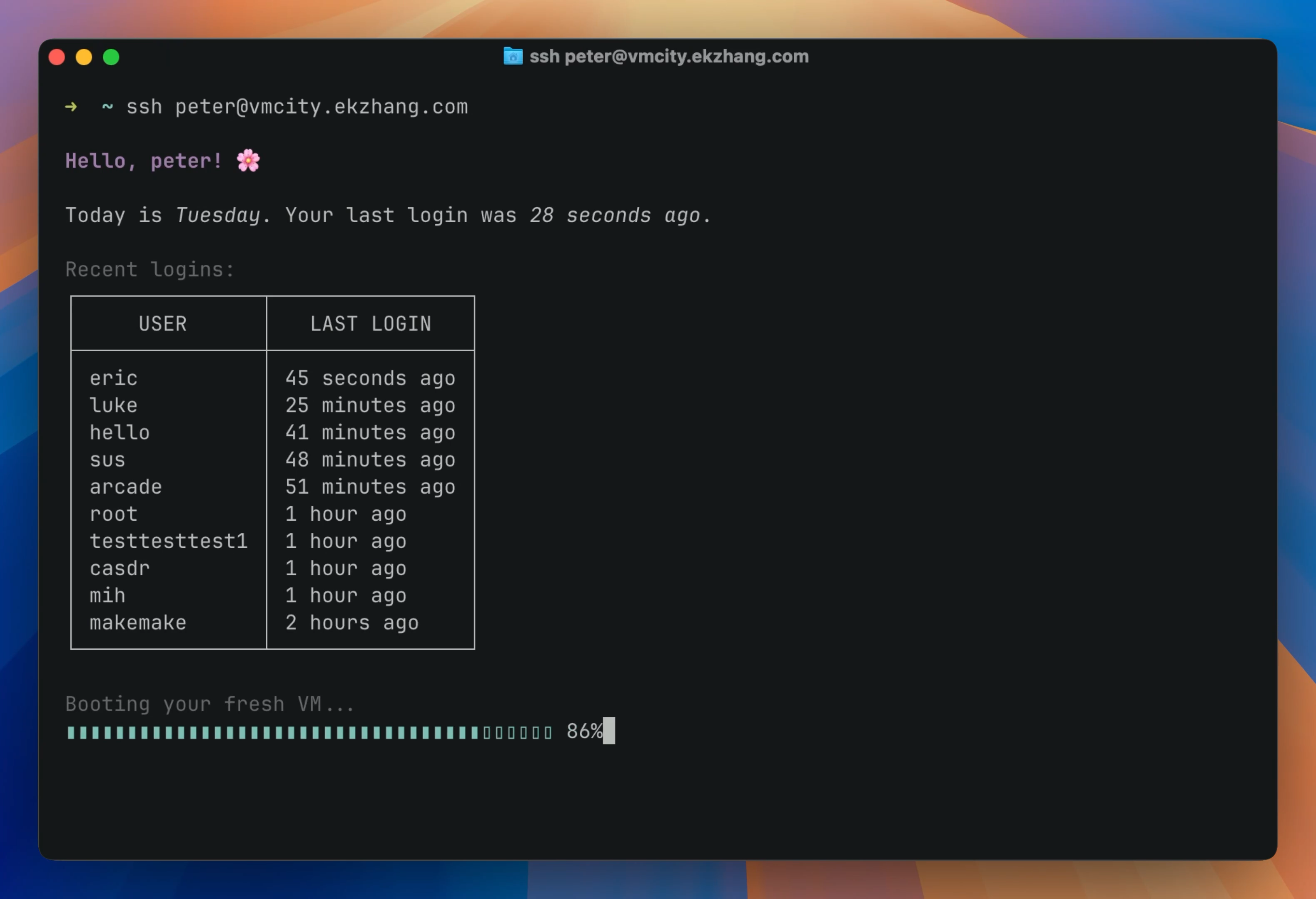 This was a fun weekend project, but it hints at a simple building block for per-user sandboxes and lightweight VM provisioning via SSH.